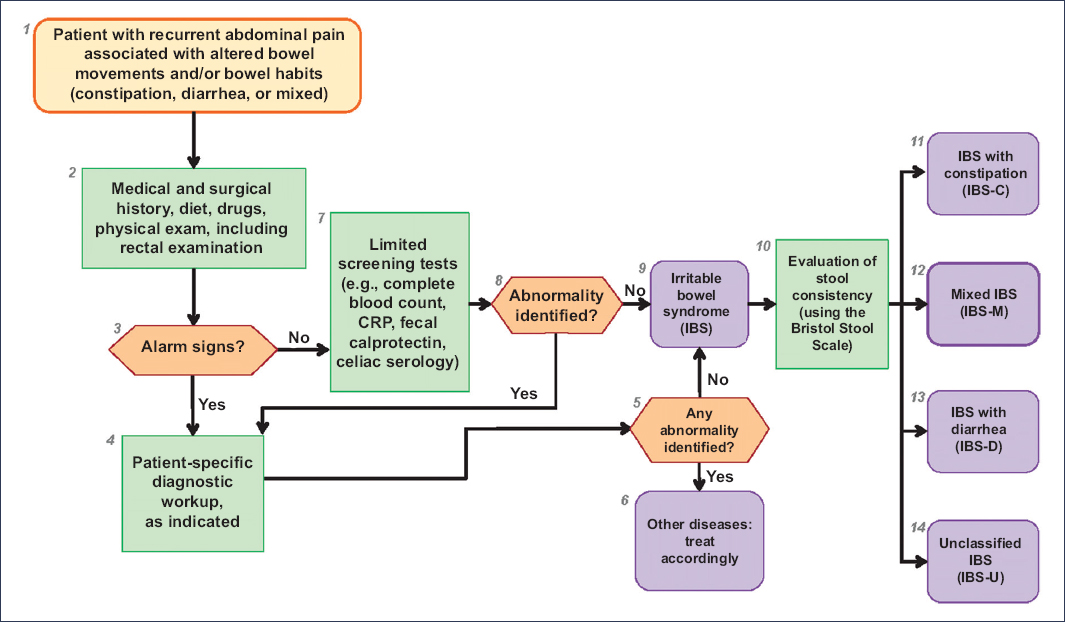 The diagnosis of IBS is fundamentally based on the Rome IV criteria, which identify patients through cardinal symptoms such as recurrent abdominal pain associated with altered bowel habits and stool consistency. These criteria were developed to standardize patient selection for research, whether epidemiologic studies or clinical trials. In clinical practice, they should be used as a diagnostic guide, although clinical criteria based on Rome IV allow shortening of the diagnostic timeline when physicians are confident based on prior evaluations. Additionally, the Rome Foundation has developed diagnostic algorithms to guide the evaluation of patients with different DGBIs. Finally, by encompassing all relevant dimensions of DGBIs, the MDCP allows a comprehensive characterization of patients, facilitating the choice of personalized therapeutic strategies and optimizing long-term outcomes. In this context, the development of biomarkers may contribute in the future to better patient characterization. Although biomarkers have not yet replaced clinical criteria (Rome IV), their validation and progressive incorporation into medical practice may transform the diagnostic and therapeutic approach to IBS.