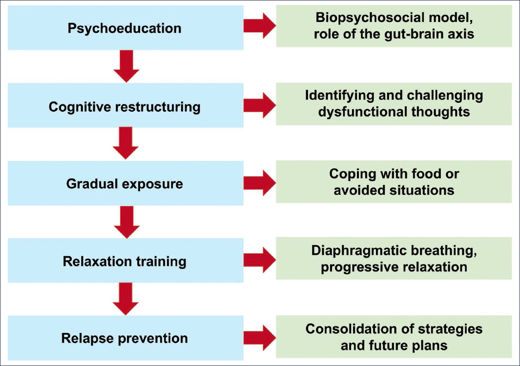 Cognitive-behavioral therapy (CBT) is the psychological intervention with the strongest empirical support in the treatment of functional gastrointestinal disorders. It is based on identifying and modifying dysfunctional thought patterns, irrational beliefs, and avoidance behaviors that amplify symptoms (Fig. 2).