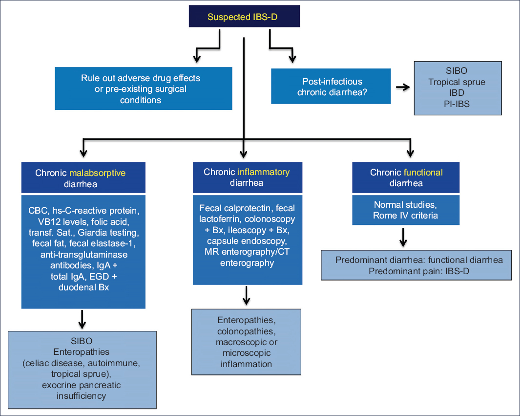 Figure 1. Diagnostic approach for IBS-D/functional diarrhea. SIBO, small intestinal bacterial overgrowth; IBD, inflammatory bowel disease; IBS-D, irritable bowel syndrome with diarrhea; PI-IBS, postinfectious irritable bowel syndrome; CBC, complete blood count; hsCRP, high-sensitivity C-reactive protein; VB12, vitamin B12; transf. sat, transferrin saturation; EGD, esophagogastroduodenoscopy; Bx, biopsy; MRI, magnetic resonance imaging; CT, contrast-enhanced computed tomography.