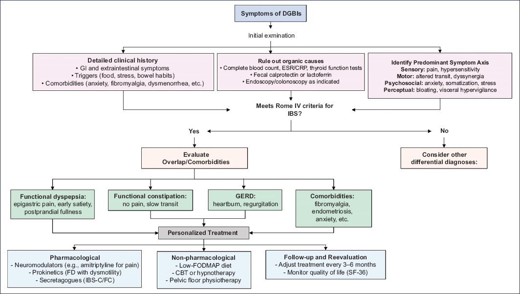 Overlap of DGBI is associated with greater severity of GI symptoms, poorer quality of life, higher psychological burden (anxiety, depression, somatization), and lower response to first-line therapies. For example, patients with IBS and FD often experience greater symptom intensity and higher emotional burden compared with those presenting a single DGBI. This clinical complexity reinforces the need to identify overlap from the initial evaluation and to adapt the diagnostic–therapeutic approach in an integrated manner, considering all symptomatic axes involved.