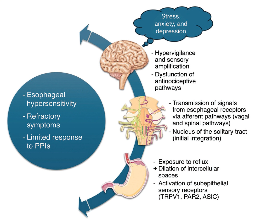 The perception of reflux is the result not only of peripheral stimuli but also of their processing in the central nervous system (Fig. 1). In this context, the esophagus-brain axis has emerged as a central component in the pathophysiology of GERD, especially in subgroups with refractory symptoms or in the absence of clinical-endoscopic correlation8.