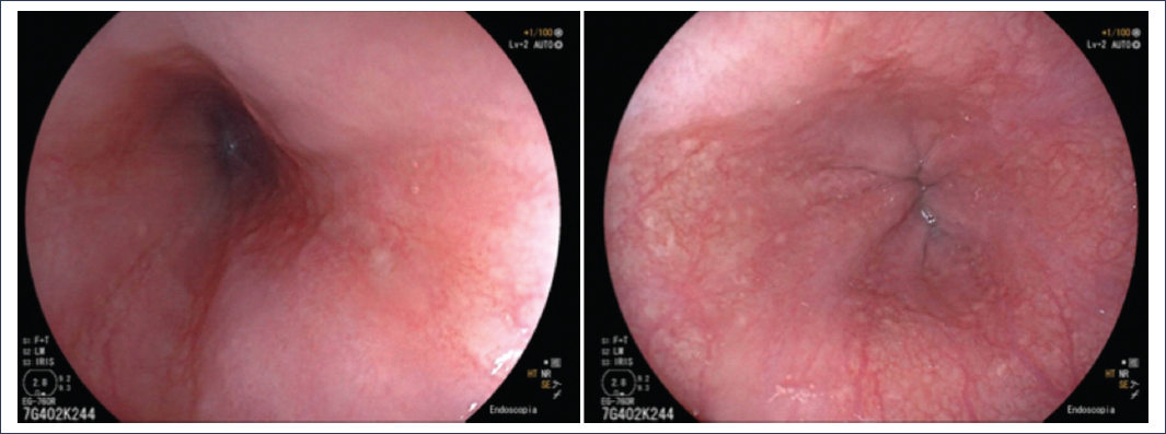 Dentro de los fenotipos de la ERGE, la enfermedad por reflujo no erosiva (ERNE) es la más frecuente en la práctica clínica, pues se presenta hasta en el 70% de los pacientes evaluados por endoscopía2,5. Los pacientes pueden tener manifestaciones clínicas típicas y atípicas de reflujo, pero la endoscopía no muestra anormalidades en el esófago ni en las biopsias obtenidas del mismo. La figura 2 muestra una imagen endoscópica típica de un paciente con ERNE.