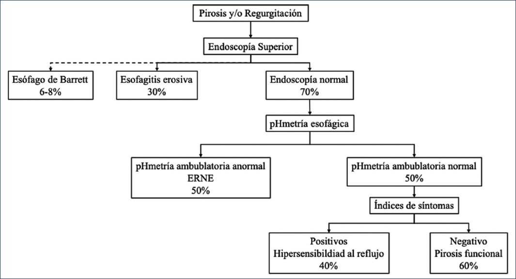 En este grupo de pacientes es indispensable realizar un diagnóstico de precisión por medio de una pH-metría ambulatoria, ya que, como se puede apreciar en la figura 3, solo el 50% tendrán una «verdadera ERNE», mientras que el resto padecerán un trastorno funcional esofágico (pirosis funcional e hipersensibilidad al reflujo).
