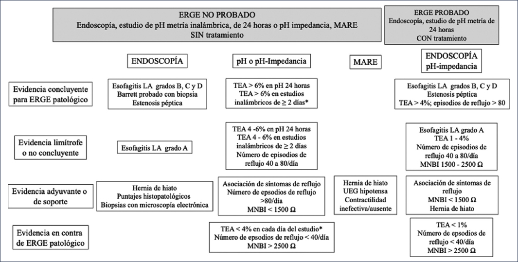 En muchas ocasiones, el diagnóstico de esta condición es retador porque la presentación clínica y la fisiopatología son muy heterogéneas y suelen ser indistinguibles sin pruebas que permitan hacer un diagnóstico de precisión6. Atendiendo a este problema, el consenso de Lyon 2.04 (Fig. 4) ha provisto de una serie de criterios y herramientas que ayudan a discriminar entre los pacientes que se encuentran en este grupo; así, la evidencia concluyente para el diagnóstico de ERGE está dada por un tiempo de exposición al ácido (TEA) mayor del 6%. Cuando el TEA se encuentra entre el 4% y el 6% se precisan criterios complementarios para tener una mejor certidumbre en el diagnóstico, los cuales incluyen el número de episodios de reflujo, la histología y las métricas de impedancia basal, entre otros.