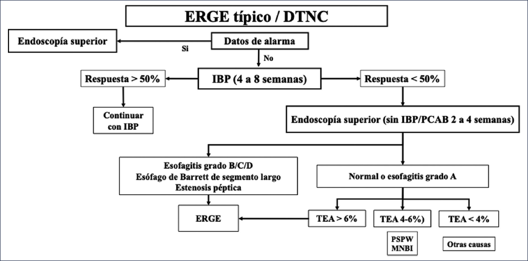 Figura 6. Clasificación de los pacientes basada en estudios diagnósticos en la enfermedad por reflujo gastroesofágico (ERGE). DTNC: dolor torácico no cardiaco; IBP: inhibidor de la bomba de protones; MNBI: impedancia basal nocturna media; PCAB: bloqueador de ácido competitivo con potasio; PSPW: onda peristáltica posdeglución; TEA: tiempo de exposición al ácido (modificado de Valdovinos-Díaz et al.2).