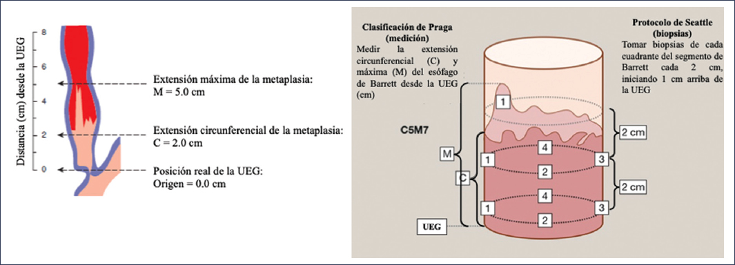 Figura 7. Sistema de reporte de la clasificación de Praga y protocolo de Seattle en el esófago de Barrett26,28–30. UEG: unión esofagogástrica.