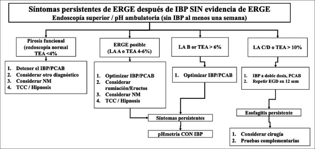 Figura 8. Algoritmo diagnóstico y terapéutico para pacientes con síntomas persistentes de reflujo sin evidencia objetiva previa de enfermedad por reflujo gastroesofágico (ERGE)2. EGD: endoscopía superior; IBP: inhibidor de la bomba de protones; LA: Los Ángeles; NM: neuromodulador; PCAB: bloqueador de ácido competitivo con potasio; TCC: terapia cognitivo-conductual; TEA: tiempo de exposición al ácido.