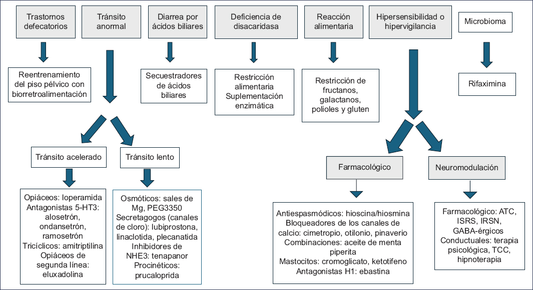 La identificación adecuada de los subtipos de SII y sus fenotipos es de suma importancia, ya que permite realizar un abordaje y un tratamiento individualizado que impacta de manera favorable en el alivio de los síntomas y la mejora de la calidad de vida de los pacientes. Entre las distintas opciones de tratamiento se encuentran las modificaciones dietéticas y el tratamiento farmacológico, en el cual se incluyen laxantes, antidiarreicos, antiespasmódicos y neuromoduladores. Las opciones no farmacológicas, como las terapias psicológicas, son efectivas en ciertos pacientes, sobre todo en aquellos que cuentan con el antecedente de eventos adversos a temprana edad. También es fundamental el abordaje del SII de acuerdo con el grupo de edad, ya que el tratamiento y la respuesta a este pueden variar según las características de cada grupo especial.