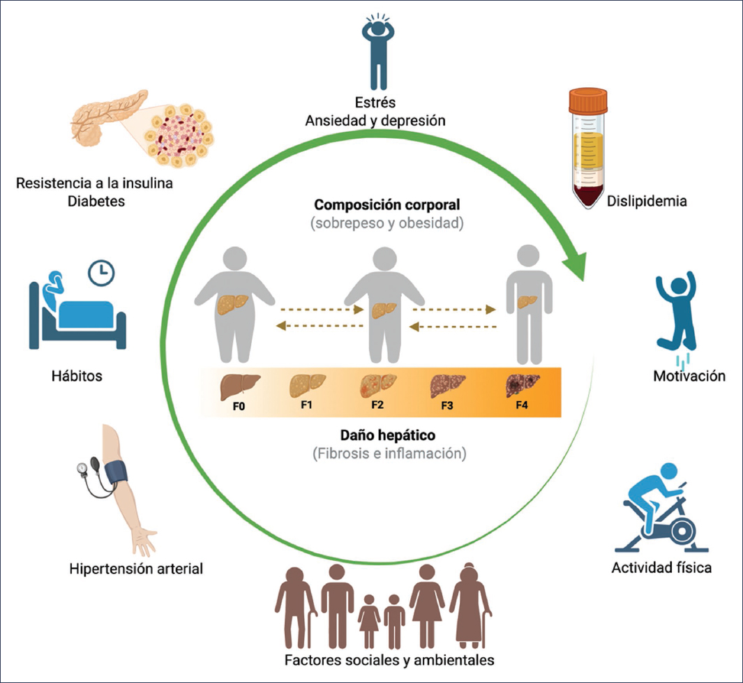 Por lo anterior, antes de establecer una intervención nutricional en la MASLD se debe considerar y analizar la heterogeneidad de la comorbilidad presente en cada paciente, aunado a la presencia o no de inflamación (esteatohepatitis) y fibrosis hepática. Por ejemplo, en pacientes con obesidad que cumplen criterios de síndrome metabólico se ha demostrado que la restricción calórica con énfasis en la calidad de los macronutrientes, como la adopción de patrones dietéticos de estilo mediterráneo ricos en grasas monoinsaturadas y poliinsaturadas, mejora la sensibilidad a la insulina, reduce la carga lipídica hepática y modula la inflamación sistémica2. En los pacientes con diabetes tipo 2, el control estricto de la ingesta de glucosa y de alimentos con un alto índice glucémico es esencial para mejorar el metabolismo hepático y prevenir la progresión de la enfermedad7. Por tanto, cada situación de comorbilidad impone unos requisitos nutricionales específicos que deben ser abordados para optimizar los resultados terapéuticos.