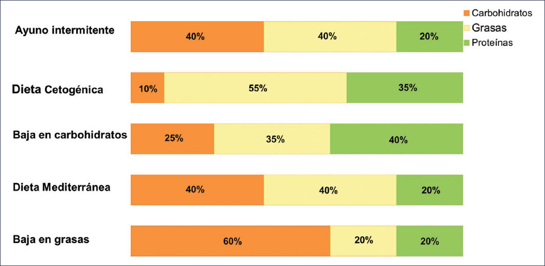 Figura 2. Distribución de los macronutrientes en los diferentes tipos de dieta para la MASLD. Los macronutrientes se presentan como porcentaje relativo de la energía total. Se recomienda que la distribución de macronutrientes en la dieta con restricción horaria se ajuste a la dieta mediterránea, aunque puede variar.