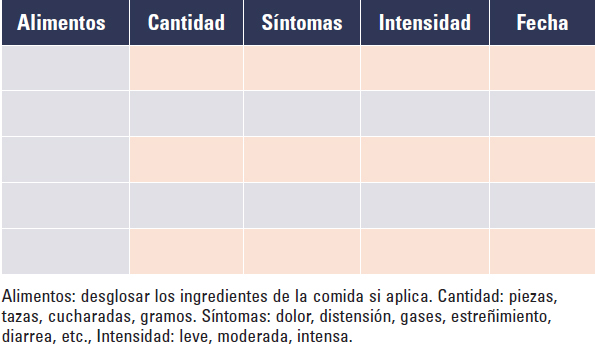 Dado que el SII presenta los subtipos de diarrea, estreñimiento y mixto, es fundamental conocer los desencadenates para orientar el manejo dietético. La principal herramienta que puede ser de utilidad para identificar detonantes es el diario o bitácora de alimentos, donde se solicita al paciente que monitorice y registre los alimentos consumidos previamente a la aparición de síntomas con la finalidad de poder relacionarlos con ellos. La figura 1 muestra un ejemplo de formato de bitácora que el paciente puede llenar. Otras opciones son: