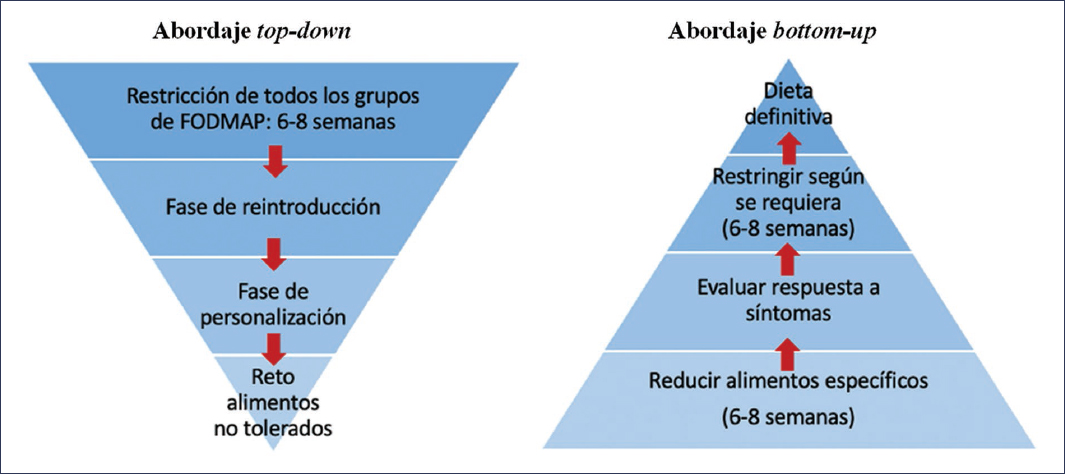 Tuck et al.4 evaluaron la respuesta en cada una de las fases de la dieta baja en FODMAP en 80 pacientes, y observaron que el 78% siguieron la dieta durante la fase 1 (restricción), pero esto se redujo en un 30% para la fase 2 (reintroducción) y en un 8% adicional para la fase 3 (personalización), lo que resultó en que solo el 40% siguieron adecuadamente las tres fases. Por ello, se propone un enfoque alternativo menos restrictivo y basado en el historial dietético, denominado Bottom-up. En este abordaje, de forma inicial solo se restringen uno o dos subgrupos específicos de FODMAP, se evalúa la respuesta sintomática y solo se continúa restringiendo si es necesario. Se sugiere empezar con los fructanos, el manitol y los galactooligosacáridos, al ser los subgrupos de FODMAP más reportados como detonantes (Fig. 2)5.