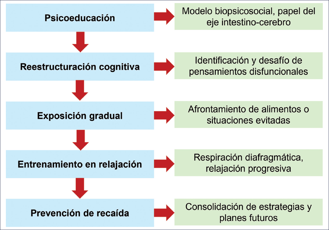 La terapia cognitivo-conductual (TCC) es la intervención psicológica con mayor respaldo empírico en el tratamiento de los trastornos funcionales digestivos. Se basa en identificar y modificar patrones de pensamiento disfuncionales, creencias irracionales y conductas de evitación que amplifican los síntomas (Fig. 2).