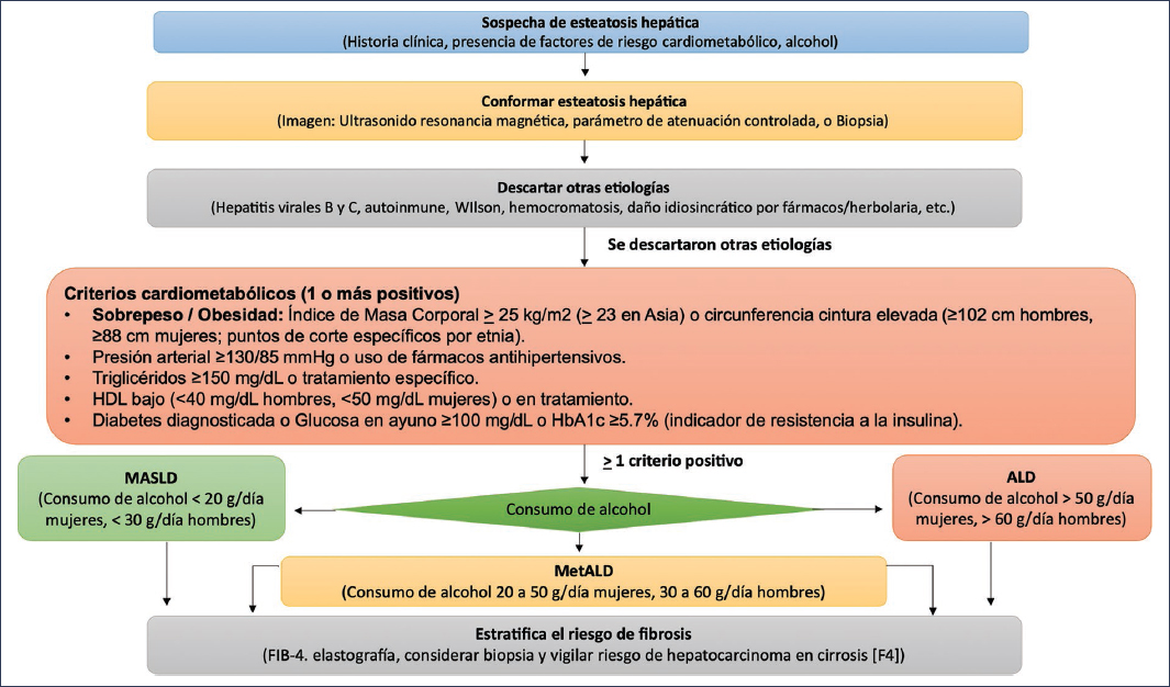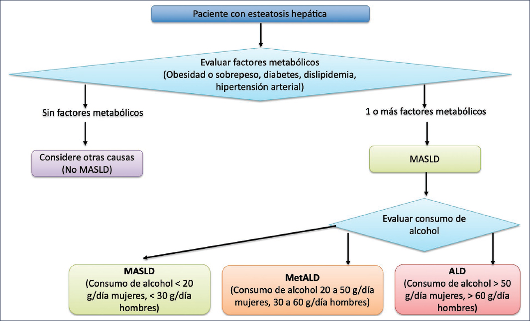 En 2023 se redefinió la enfermedad hepática grasa no alcohólica (NAFLD, Non-Alcoholic Fatty Liver Disease) como esteatosis hepática metabólica (MASLD, Metabolic dysfunction Associated Steatotic Liver Disease), y así mismo la esteatohepatitis no alcohólica (NASH, Non-Alcoholic Steatohepatitis) fue redefinida como esteatohepatitis de origen metabólico (MASH, Metabolic dysfunction Associated Steato Hepatitis). Dentro de esta nueva clasificación se propuso una nueva categoría, actualmente denominada MetALD (Metabolic dysfunction and Alcohol-related Liver Disease), en la que convergen pacientes que cumplen criterios para MASLD y que además tienen consumo riesgoso de alcohol1, considerado este como 140-350 g/semana (20-50 g/día) en las mujeres y 210-420 g/semana (30-60 g/día) en los hombres2. La propuesta, de acuerdo con esta nueva nomenclatura, para establecer los criterios de MetALD se muestra en la figura 1.