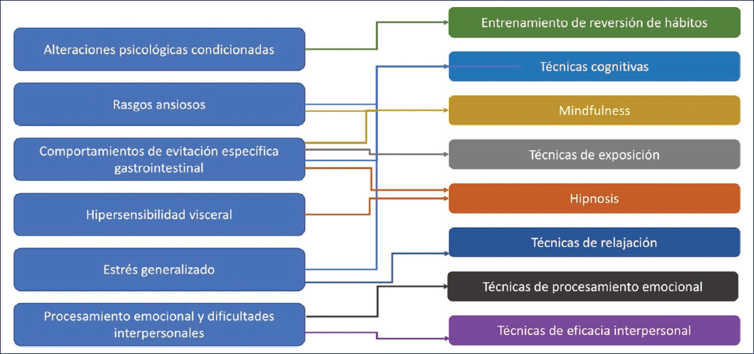 La TCC es una de las terapias conductuales mejor estudiadas en los TIIC. Se ha demostrado su efectividad en el SII, en el dolor torácico no cardiaco y en la dispepsia funcional. Al parecer, la mejoría de los síntomas no se debe a una modificación en el estrés o la ansiedad generalizados, sino a un cambio en el comportamiento de evitación y los conceptos asociados con la enfermedad12. La TCC se basa en incidir sobre los procesos cognitivos, afectivos y de comportamiento que disparan o exacerban los síntomas digestivos. Los pacientes con TIIC manifiestan hipervigilancia, miedo e incomodidad excesivos por los síntomas, y muestran comportamientos de evitación excesivos13. Las características predictoras de respuesta al tratamiento en la TCC incluyen al grado de ansiedad gastrointestinal, la alexitimia, los rasgos ansiosos, la sensibilidad a la ansiedad y los estilos de adaptación66.
