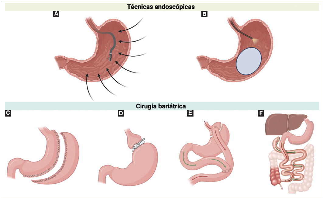 Figura 1. Técnicas endoscópicas y cirugía bariátrica en la MASLD. A: gastroplastia endoscópica en manga. Se utiliza un endoscopio con un dispositivo de sutura, para reducir el tamaño y el volumen del estómago mediante suturas permanentes a lo largo de la curvatura mayor, desde el antro hasta el fondo. B: balón intragástrico. Se inserta un balón colapsado en el estómago mediante un dispositivo endoscópico y una vez en el estómago se llena con solución salina o con aire, ocupando espacio y promoviendo la sensación de saciedad. C: gastrectomía en manga. Se extirpa entre el 75% y el 85% del estómago a lo largo de la curvatura mayor, desde el antro hasta el fondo. D: banda gástrica ajustable. Limita la ingesta de alimentos mediante la colocación de un anillo constrictor que rodea por completo el fondo gástrico. E: bypass gástrico en Y de Roux. Combina la reducción del tamaño del estómago con el bypass del estómago distal y el intestino delgado proximal (50-100 cm), lo que da como resultado una conexión intestinal con forma de letra Y. F: derivación biliopancreática con switch duodenal. Reduce el tamaño del estómago y deriva el intestino delgado (150-200 cm), lo que da como resultado una gastroyeyunostomía sin la configuración de enterostomía en forma de Y.