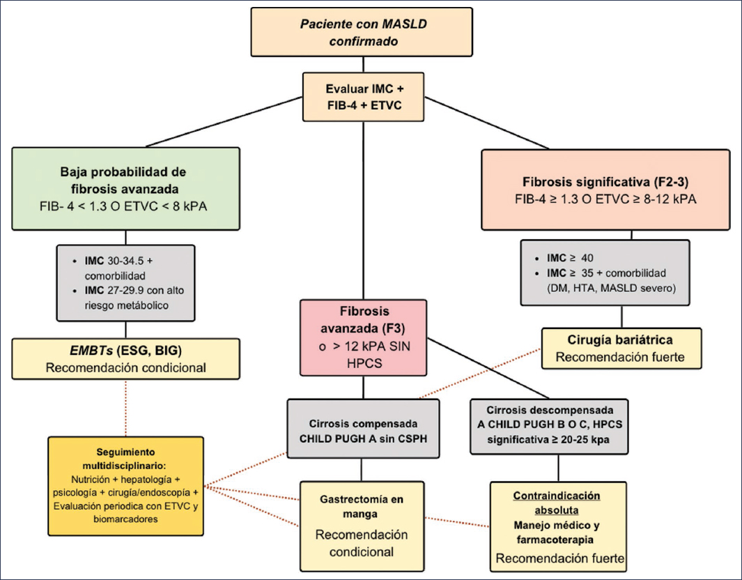 Figura 2. Algoritmo de selección: endoscopia frente a cirugía. HPCS: hipertensión portal clínicamente significativa; DM: diabetes mellitus; EMBTs: terapias bariátricas y metabólicas endoscópicas (endoscopic bariatric and metabolic therapies); ESG: gastroplastia endoscópica en manga; FIB-4: Score Fibrosis-4; HTA: hipertensión arterial; BIG: balón intragástrico; IMC: índice de masa corporal; MASLD: enfermedad hepática esteatósica asociada a disfunción metabólica (metabolic dysfunction associated steatotic liver disease); ETVC: elastografía de transición de vibración controlada