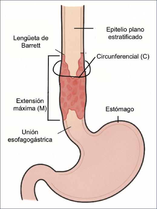 El esófago de Barrett se define endoscópicamente por la presencia de mucosa columnar (con o sin metaplasia intestinal) que se extiende proximal al límite esofagogástrico. En la endoscopia, esta mucosa se observa como lengüetas (tongues) o como una banda circunferencial de color salmón rosado que reemplaza al epitelio escamoso pálido normal del esófago distal3. Para una adecuada caracterización, se utiliza la clasificación de Praga (C & M), que describe: