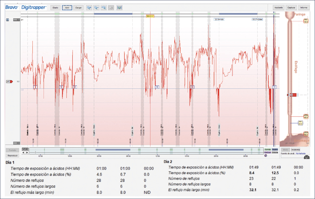 La cápsula inalámbrica de telemetría (Bravo™ Reflux Capsule, Medtronic, Minneapolis, MN, USA), que se fija a la mucosa esofágica durante una endoscopia, y el monitoreo con catéter transnasal, son métodos que presentan ventajas y limitaciones26. Durante el monitoreo se analizan múltiples variables, incluyendo el tiempo de exposición ácida (TEA), que es el parámetro de mayor importancia, así como el número de episodios de reflujo y su correlación con los síntomas. Respecto al tiempo de monitoreo con catéter transnasal, ya sea únicamente para pH-metría o para pH-metría con impedancia, en general es de 24 horas, mientras que la cápsula inalámbrica permite un registro prolongado de entre 48 y 96 horas.