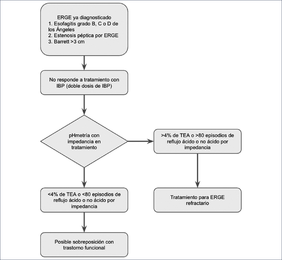 La pH-metría realizada sin tratamiento antisecretor tiene como principal indicación documentar ERNE. Para documentar ERGE refractaria se prefiere un estudio con impedancia con tratamiento antisecretor. Los parámetros para la interpretación de la pH-metría con tratamiento antisecretor son diferentes y se considera anormal la presencia de un TEA > 4% o más de 80 episodios de reflujo por impedancia; cuando se cumplen estos criterios se considera ERGE refractaria. Estos hallazgos en la pH-metría con impedancia con tratamiento antisecretor tienen una sensibilidad del 90% para predecir la respuesta a un manejo quirúrgico3,4,21,22.